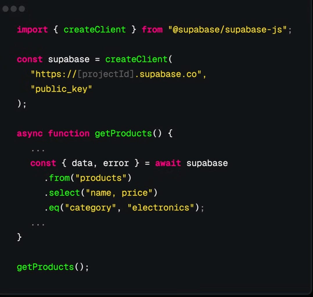 If we want to query data (“name” and “price”) from the products table where products categorized as electronics. - At first glance, it feels like you’re writing SQL right in your frontend but there’s a lot happening under the hood.