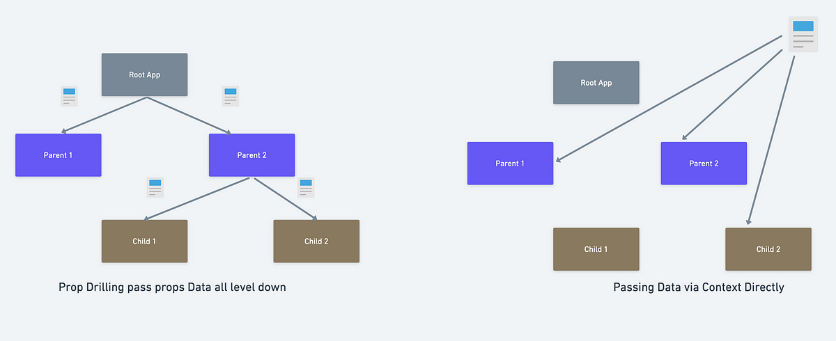 It is a powerful way to pass prop data to the app’s components. Most React apps have tons of nested components, which makes it harder for us to manage props. This is also called as prop drilling, because useless props which are not even being used by the children's components are being drilled into them.